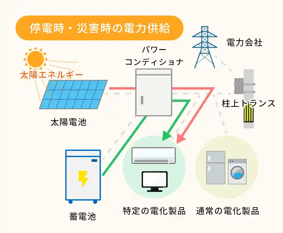 災害時にもっとも困るのは、停電。照明だけでなく、冷蔵庫やパソコンなども稼働できなくなり、それがいつまで続くかわかりません。そんなときも蓄電池があれば、安心です。