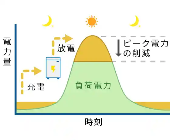 電力需要がピークになる休日や夜間などあまり事業所内電力を使わないときに蓄電池に電力を貯め、電力を多く使う時間帯に放電することで、購入電力の最大量(ピーク電力)を削減することできます。